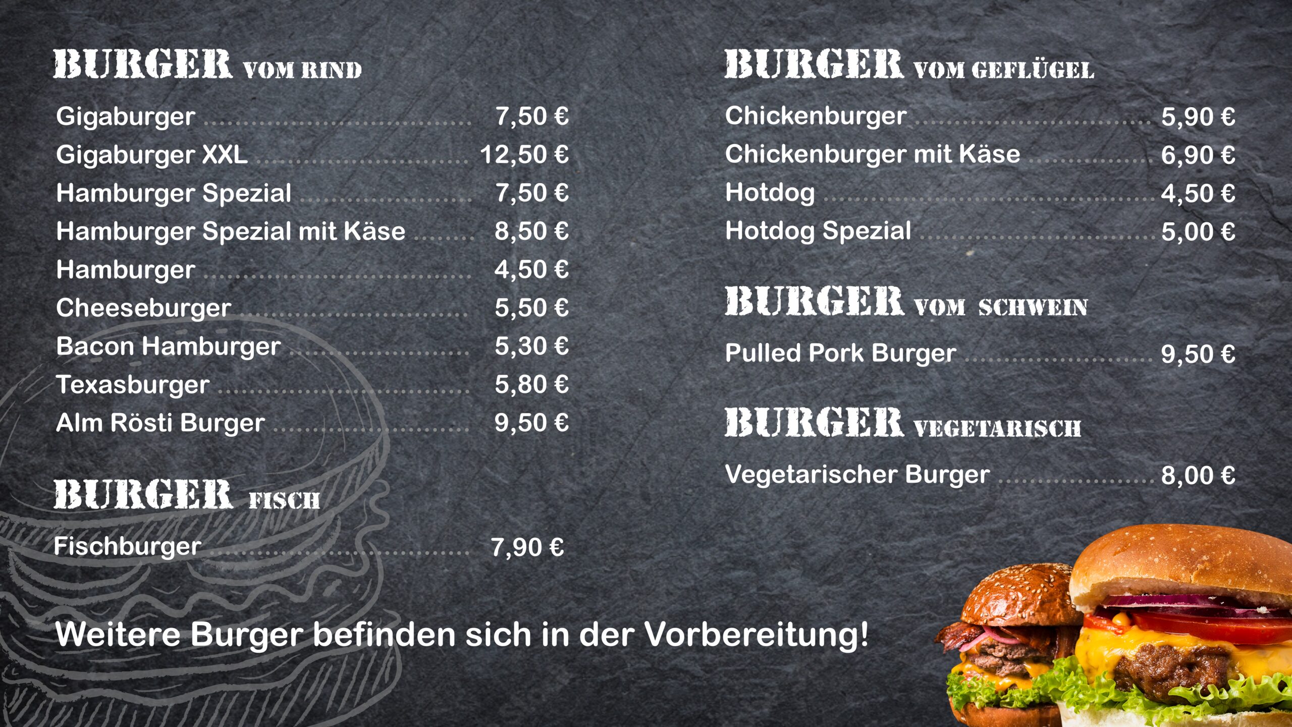 Probieren Sie unsere reichhaltige Burgerauswahl. Angefangen vom Hamburger, über den beliebten Cheeseburger bis hin zum Texasburger haben wir alles, was Ihren Gaumen erfreut. Selbstverständlich gibt es bei uns auch alle Burger als Menue!